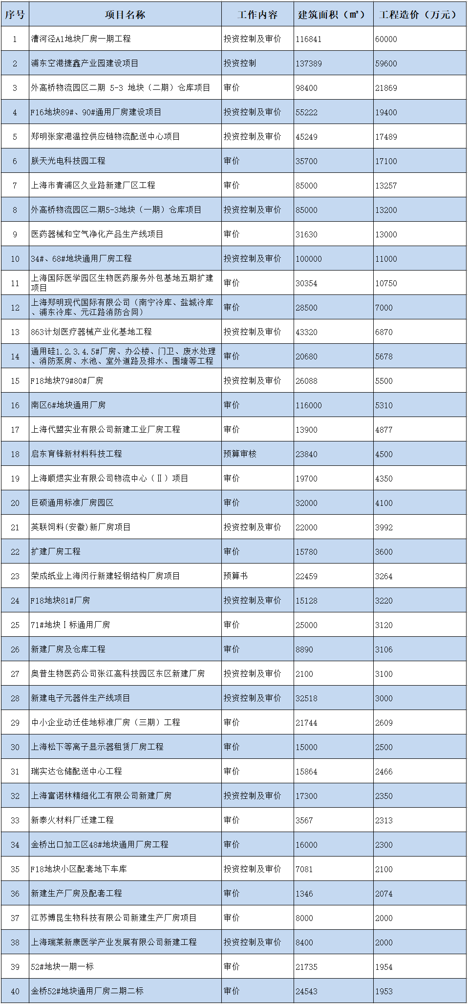 部分厂房工程造价咨询业绩一览表